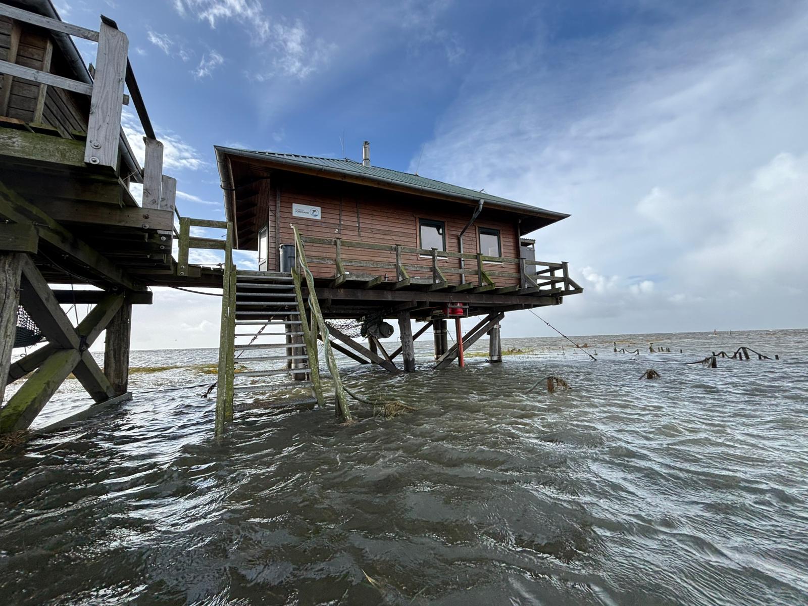 Am letzten Wochenende gab es in vielen Teilen der Nordsee hohe Pegelstände und Sturmfluten, so auch auf Norderoog. Nils Bayer, unser Vogelwart, ist zum Glück unversehrt geblieben und auch die Vögel, die in Mitleidenschaft gezogen werden könnten, brüten derzeit nicht auf Norderoog. Weil die Kameras weggeschwemmt oder untergegangen wären, mussten wir sie leider abbauen. Derzeit gibt es also keine Streams von unserer KLIMAHALLIG Norderoog. Nils Bayer wird die Kameras sobald es geht wieder aufbauen, sodass wir ab etwa Mitte der Woche wieder nach Norderoog streamen können.