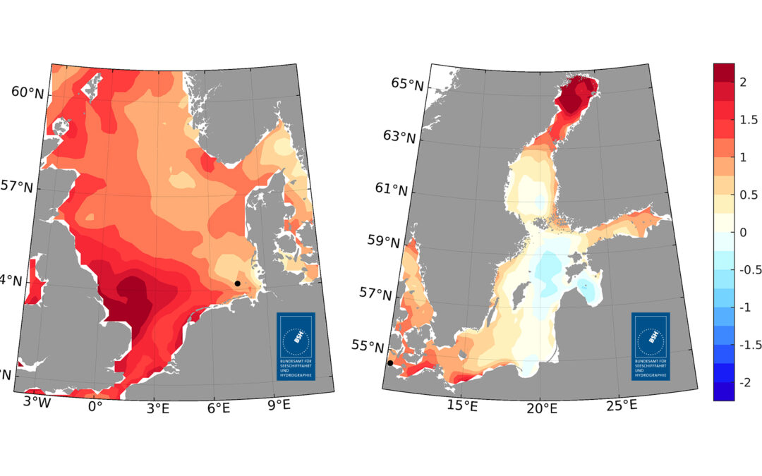In der westlichen und südwestlichen Nordsee bis zum Ärmelkanal herrschten großflächig Extremtemperaturen mit bis zu 2 Grad und mehr über dem langjährigen Mittel. Die Deutsche Bucht und die östliche Nordsee, einschließlich der Gebiete vor Dänemark und Norwegen, waren bis zu 1,3 Grad wärmer als üblich.